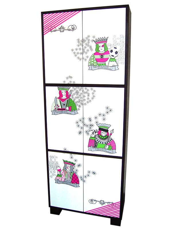 Im rechten Bild sehen Sie ein Möbelstück, welches Sie in unserer Ausstellung besichtigen und ausprobieren können. Es handelt sich dabei um einen Bücher- und Gläserschrank. In Zusammenarbeit mit der Designerin Francesca Jakin aus Italien, haben wir es entworfen und produziert. Das Design beschreibt auf ironische Art und Weise die Tugenden der Italiener. Sie benutzt die Könige aus einem Kartenspiel und beschreibt durch sie Themen wie Fußball, geselliges Trinken, Temperament und "käufliche Freundschaft". Ein absoluter Hingucker!